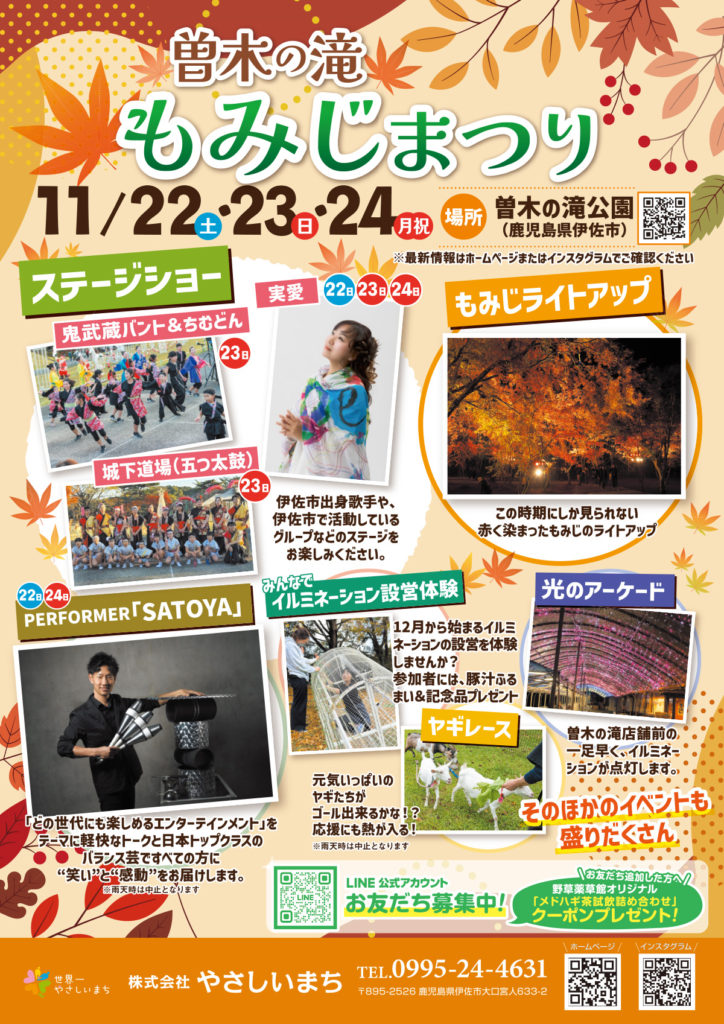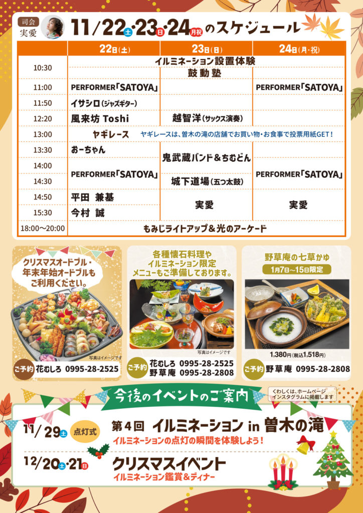 曽木の滝 もみじまつり開催(11/22〜24) 秋の風情あふれる曽木の滝で、「もみじまつり」を開催します! ライトアップに包まれた幻想的な紅葉と、音楽・パフォーマンス・動物イベントなど、 3日間にわたり楽しい催しが満載です。 ご家族やお友達と一緒に、秋の思い出をつくりにぜひお越しください。 投稿日 2025.11.07