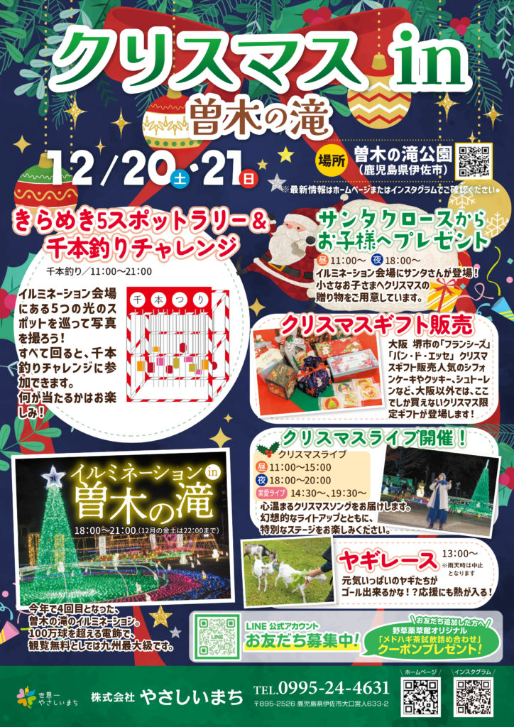 クリスマス in 曽木の滝 曽木の滝公園にて、「クリスマス in 曽木の滝」を開催いたします。 家族で楽しめる企画や、ここでしか体験できない特別なクリスマスイベントが盛りだくさん。 イルミネーションとともに、心あたたまる冬のひとときをお過ごしください。 投稿日 2025.12.14